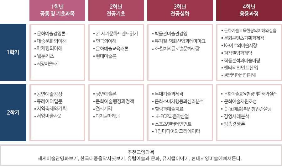 • [1학기] 박물관미술관경영, 뮤지컬영화산업과테마파크, 브랜드와문화경쟁, 엔터테인먼트산업, 문예사조사