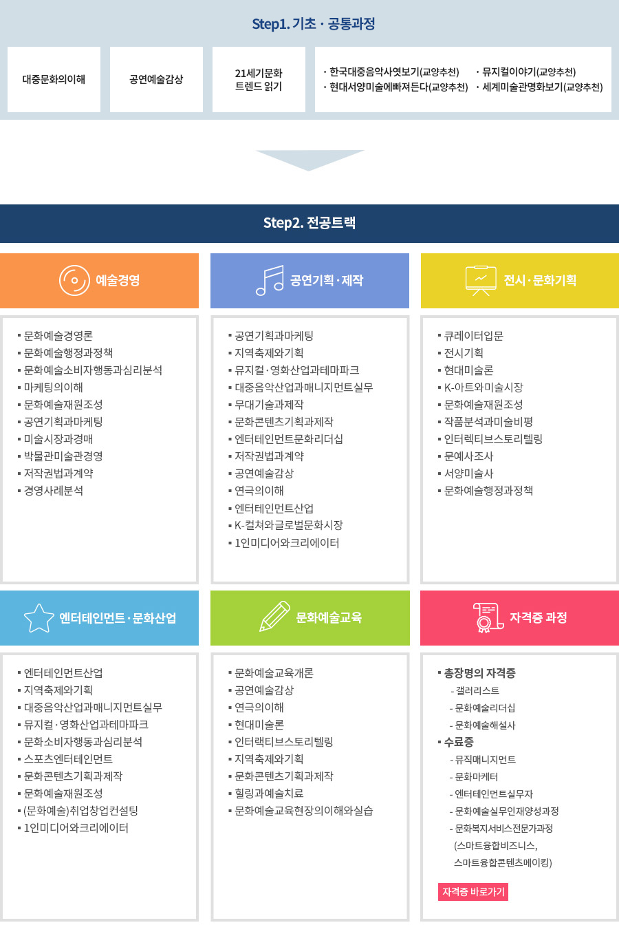 문화예술에 대한 이해, 문화 및 전시기획, 지역문화, 지역축제, 미술전시 분야의 기획, 제작, 예술홍보 및 마케팅 교육을 통한 전문 문화기획자 양성