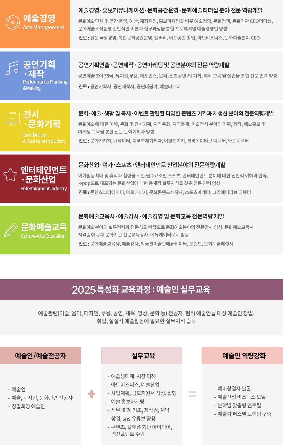 공연예술분야(연극, 뮤지컬, 무용, 퍼포먼스,음악, 전통공연) 의 기획,제작 교육 및 실습을 통한 전문인력 양성